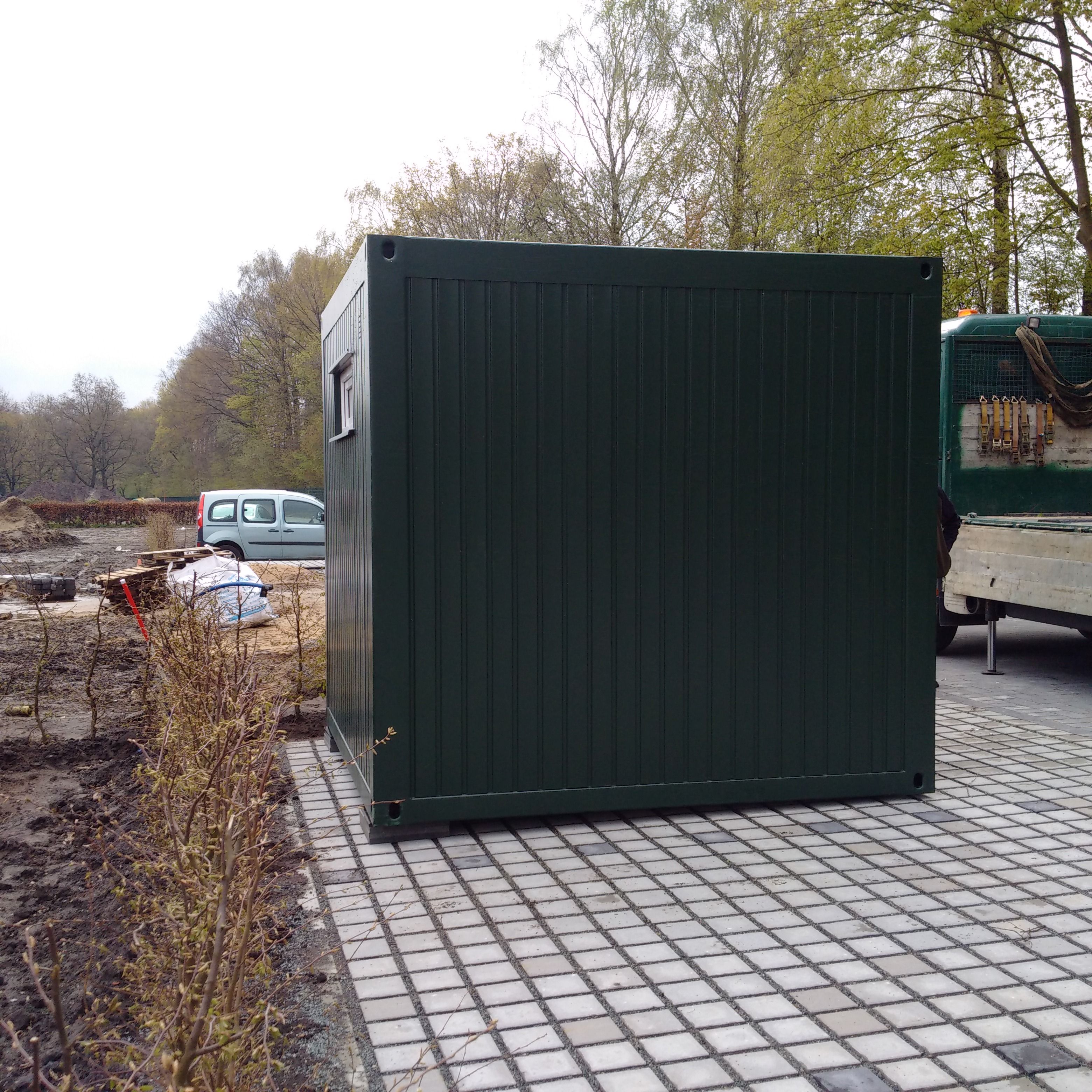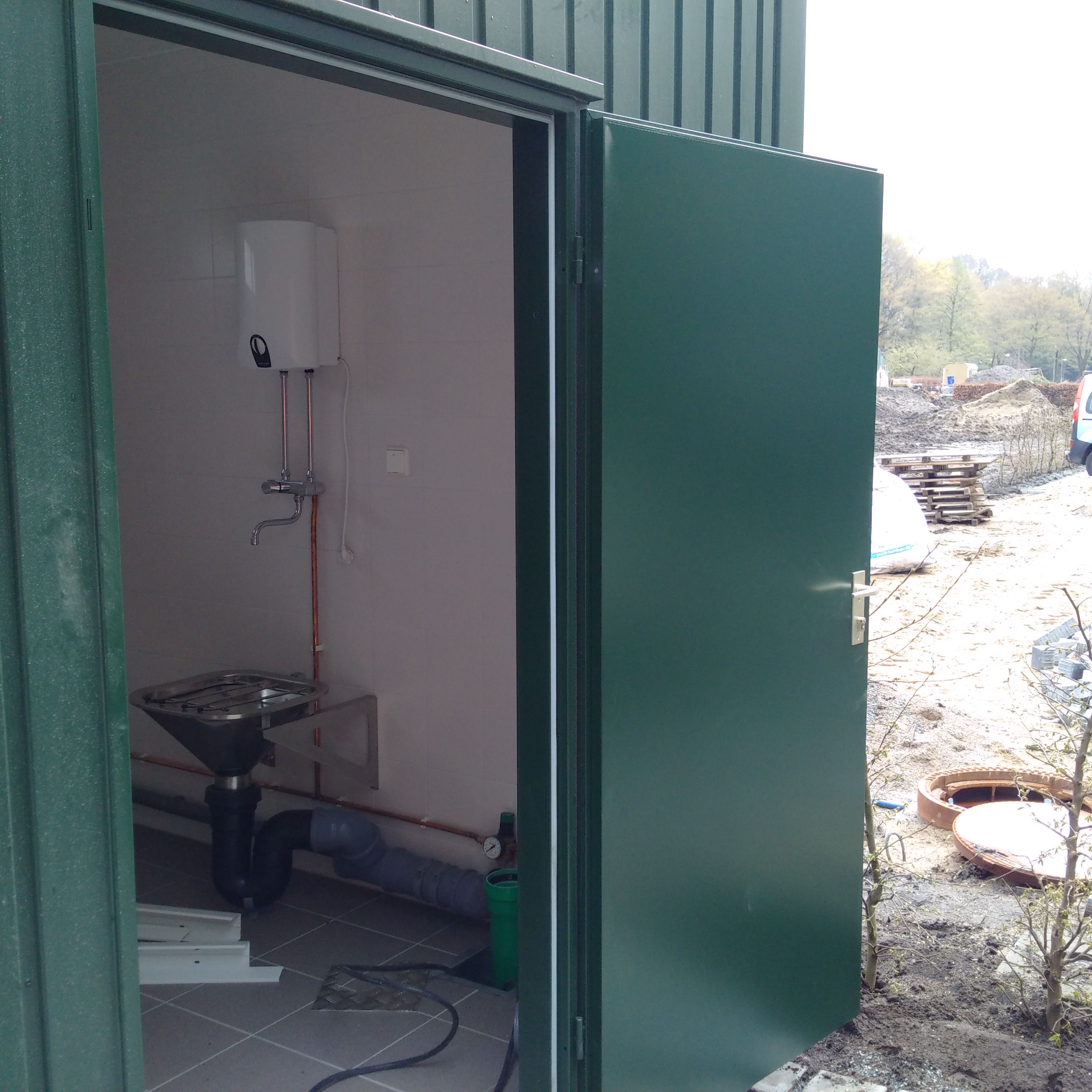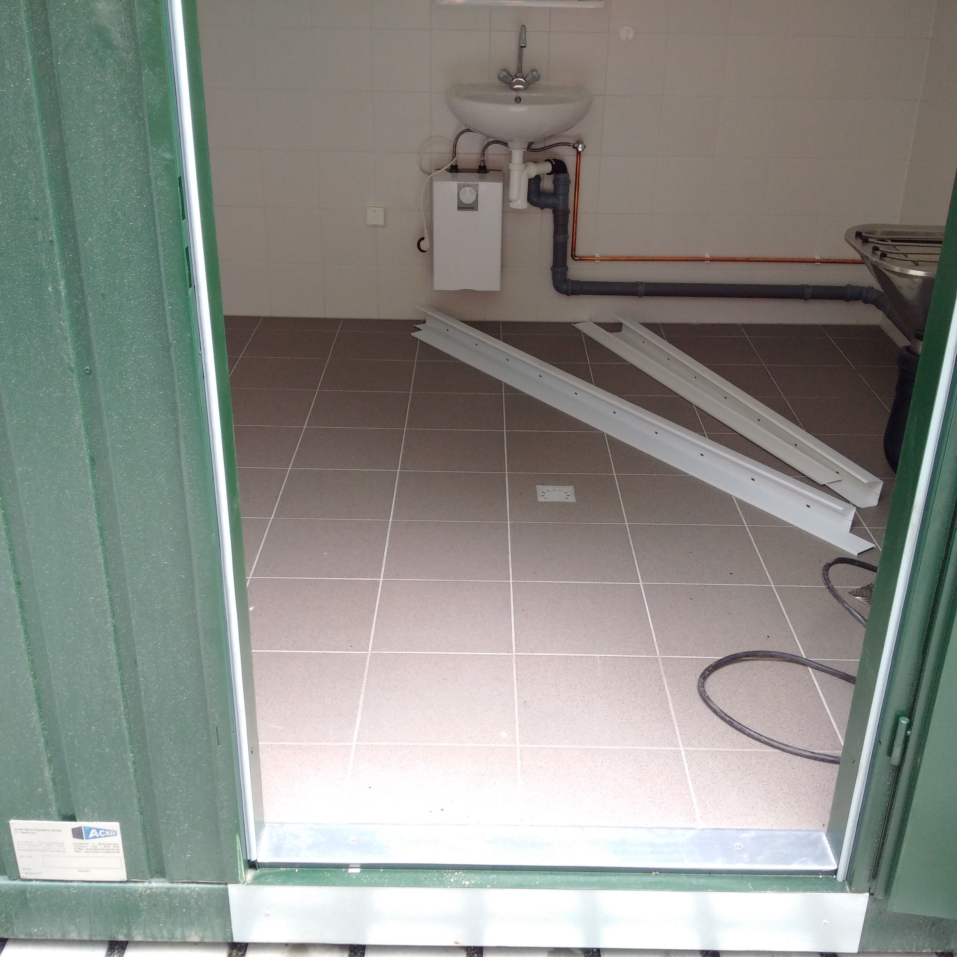 Abkippstation für Kleingartenverein in Niedersachsen. 3 x 3 m Containermass. Ausgussbecken. Fliesenboden, geflieste Wände. Rundum gedämmt. Elektrogrundinstallation.