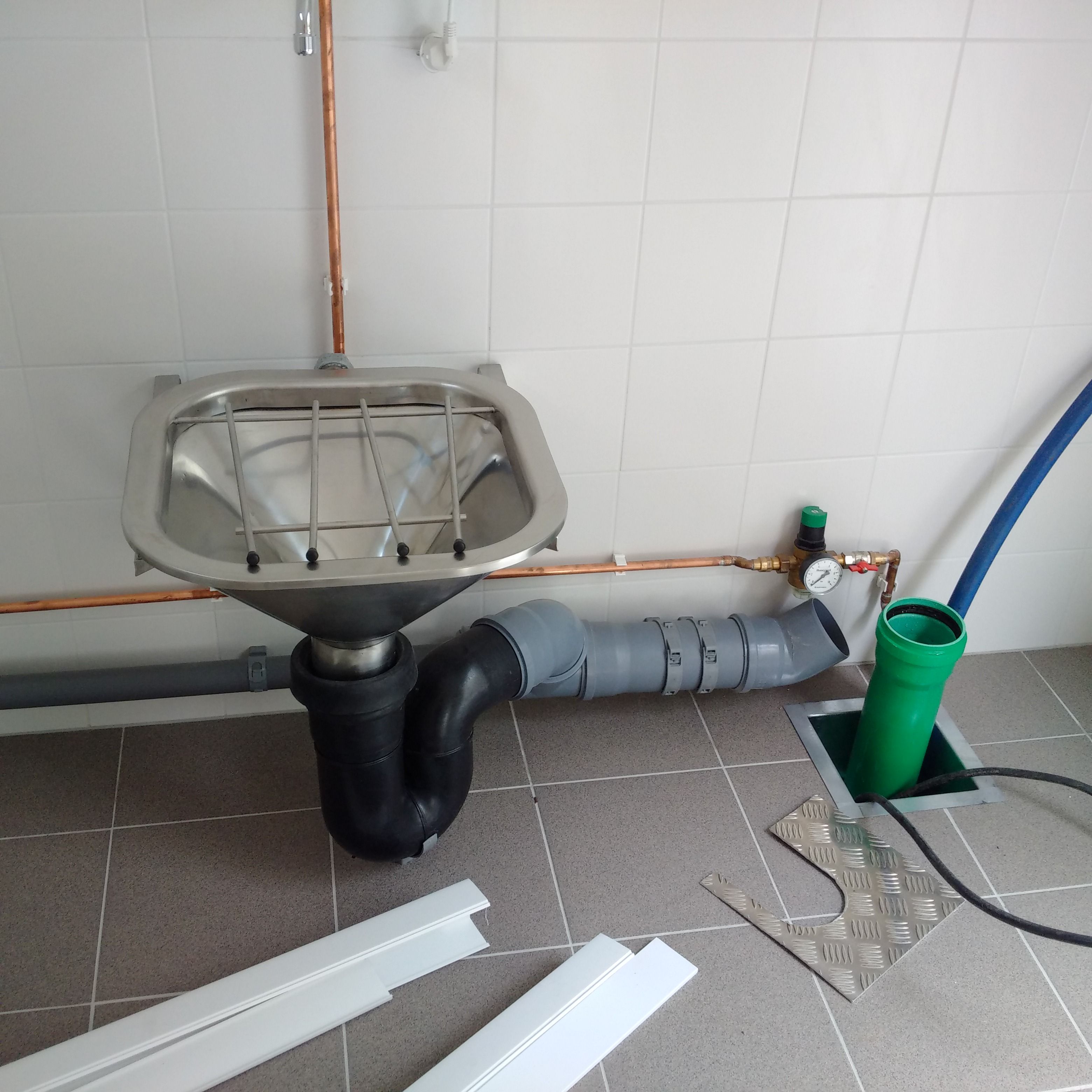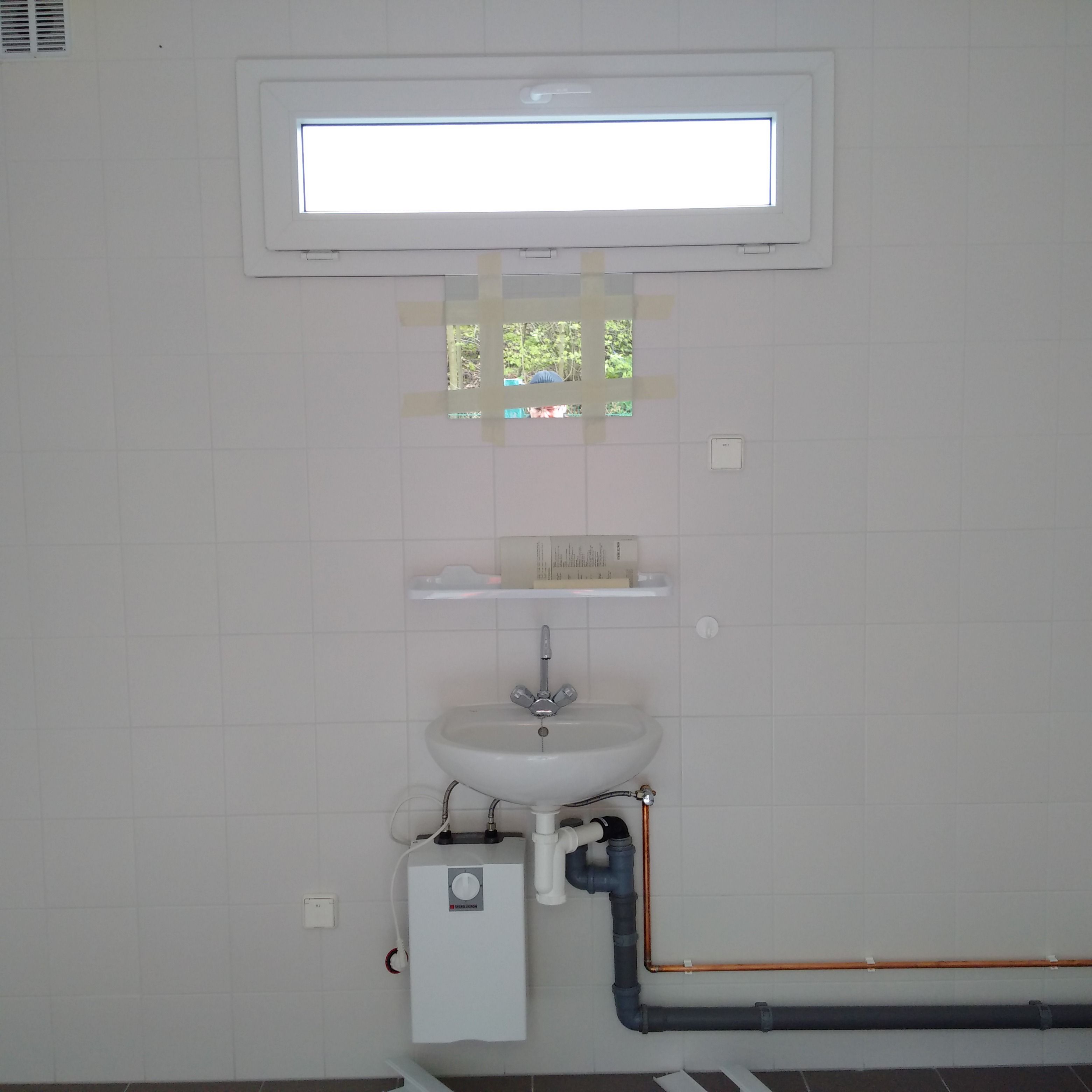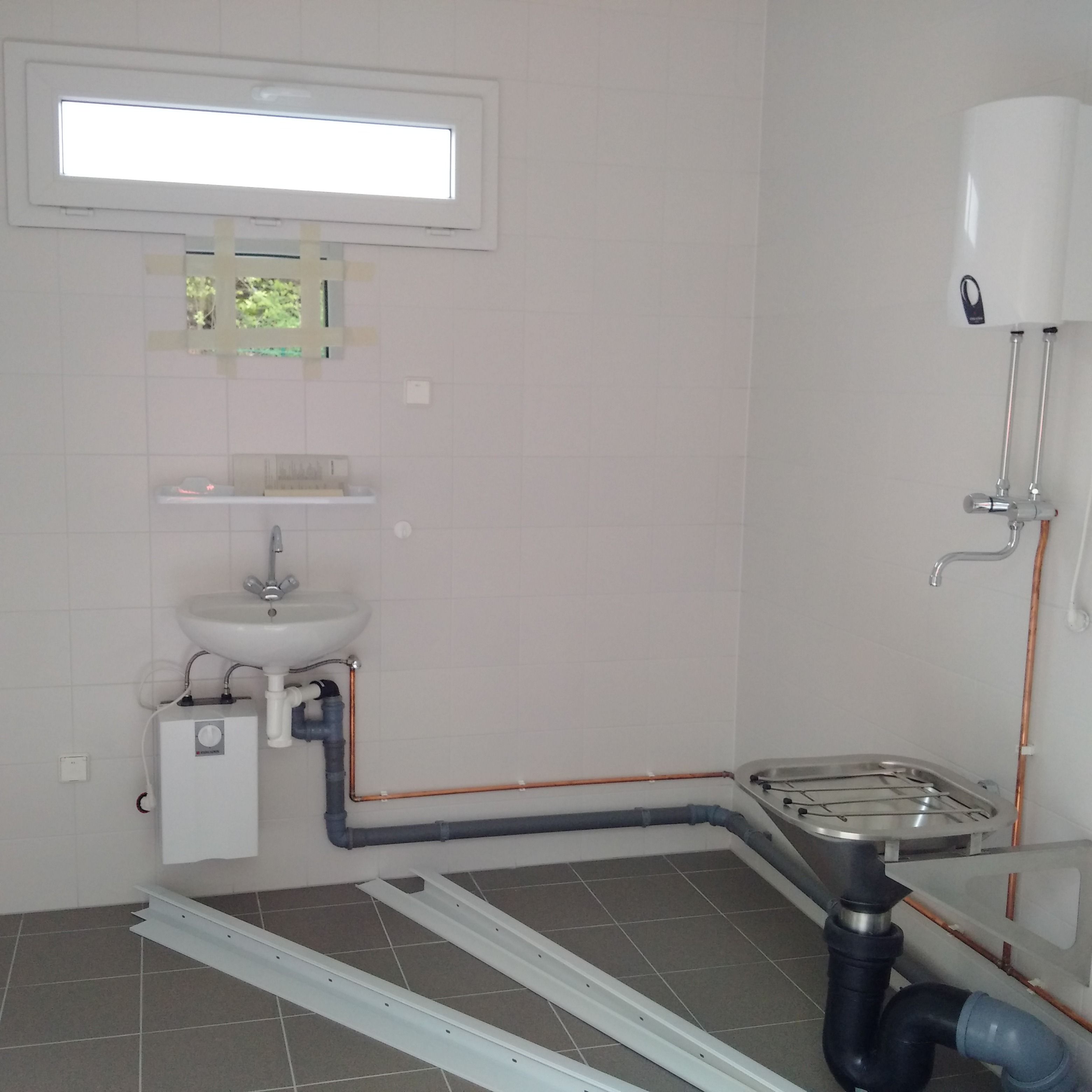 Abkippstation für Kleingartenverein in Niedersachsen. 3 x 3 m Containermass. Ausgussbecken. Fliesenboden, geflieste Wände. Rundum gedämmt. Elektrogrundinstallation.